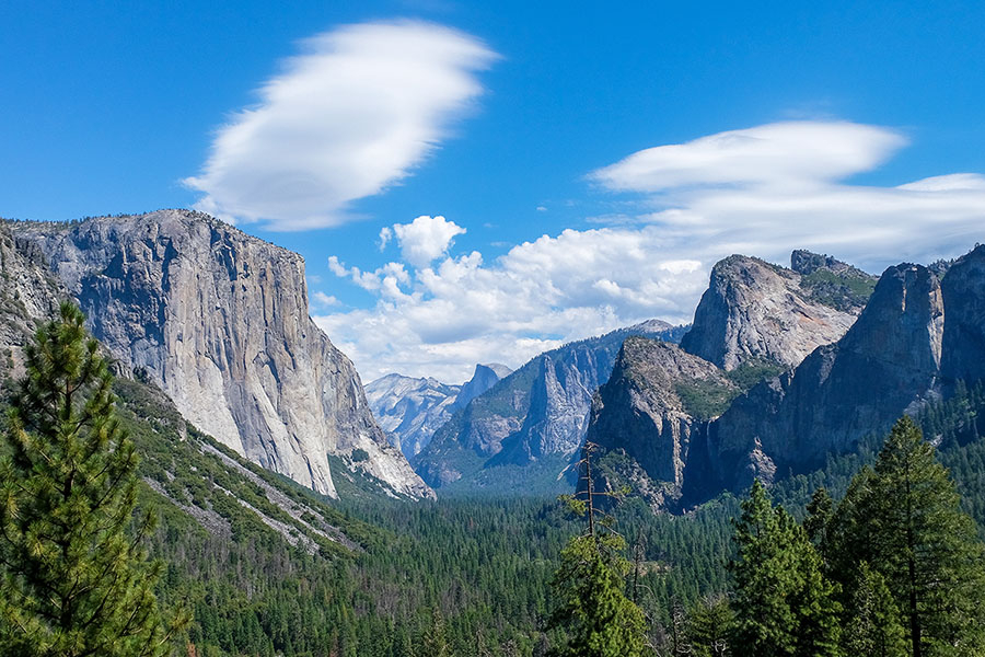 ヨセミテに来たら必ずと言っていいほど訪れる絶景スポットが、トンネルビュー。写真真ん中に小さく見えるのがハーフドーム、左側にエルキャピタン、右側にはうっすらとブライダル・ベール滝が見えます。ここに来ると、ヨセミテがいかに広大な国立公園かを実感できます。