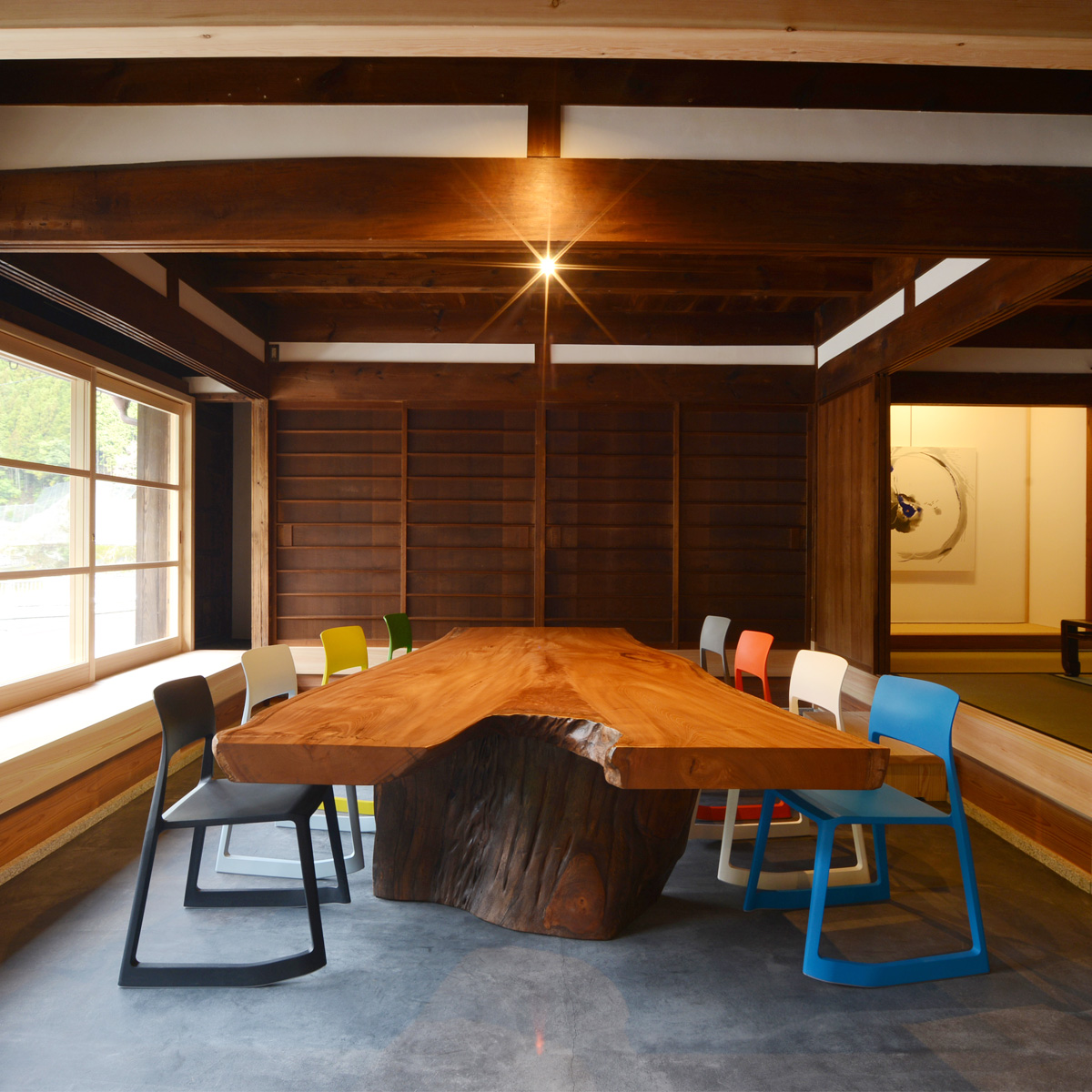 古民家を改装した2階建てのコワーキングオフィスは、1階に大きなシェアテーブルと個室。2階に3つの畳部屋があり、自由に使うことができます。